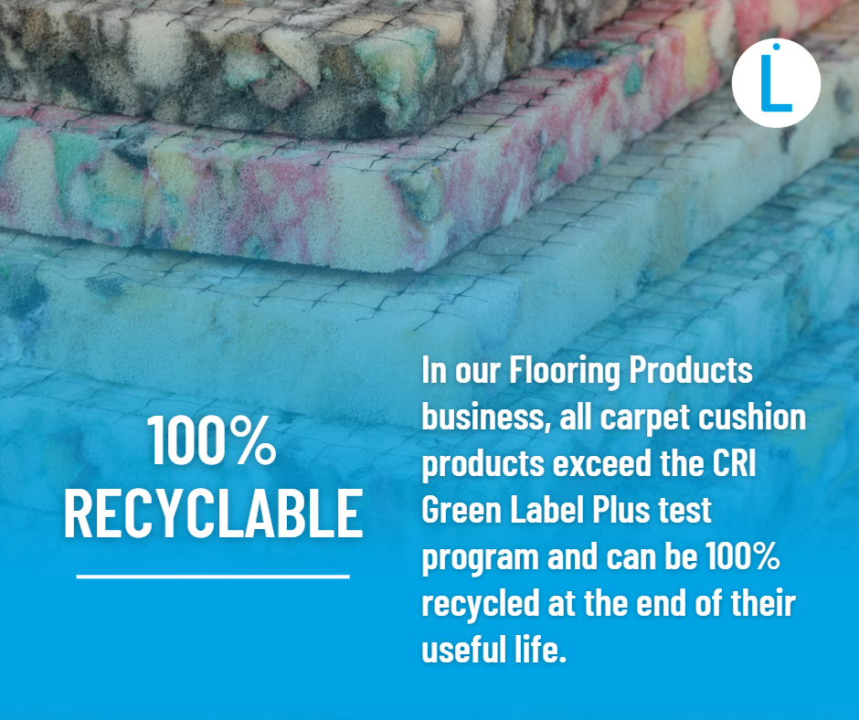 Our Flooring Products business manufactures carpet underlay products that make a direct contribution towards LEED green building certification for our customers. All products can be 100% recycled at the end of their useful life and exceed the CRI Green Label Plus test program. Green Label Plus is an independent testing program that identifies carpet, adhesive, and cushion products with very low volatile organic compounds emissions to help improve indoor air quality and helps our customers achieve LEED green building certification.