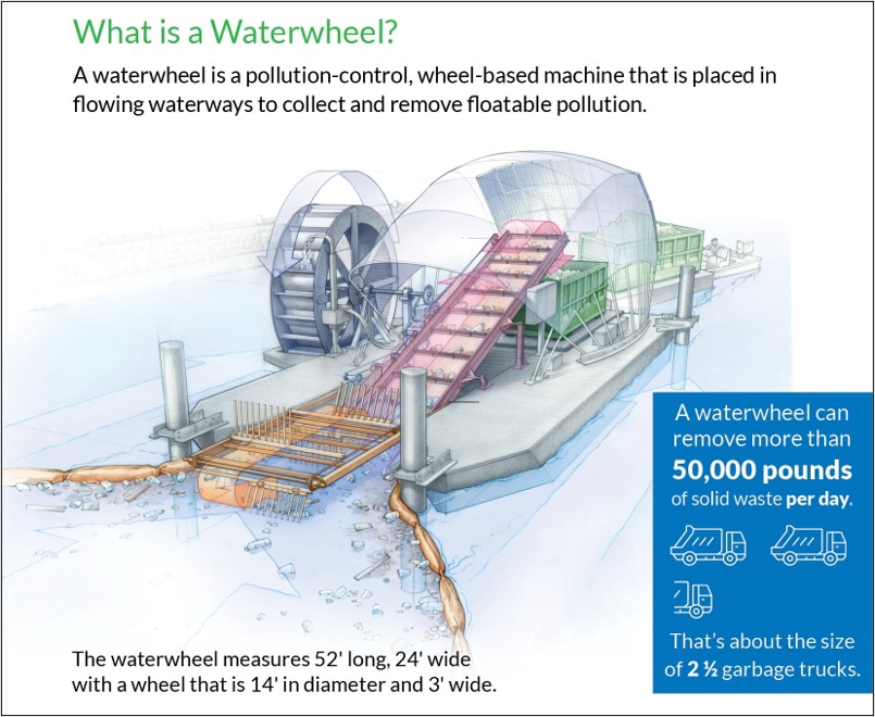 This initiative seeks to install large, solar-powered litter capture devices, or “waterwheels,” in the Trinity River. Waterwheels are a proven, sustainable, lower-cost technology to clean waterways. A waterwheel can remove up to 50,000 pounds of litter per day – about the size of two and a half garbage trucks. Removing the waste protects the water quality, improves the aesthetic and usability of the river, and improves the aquatic ecosystem for fish and wildlife.